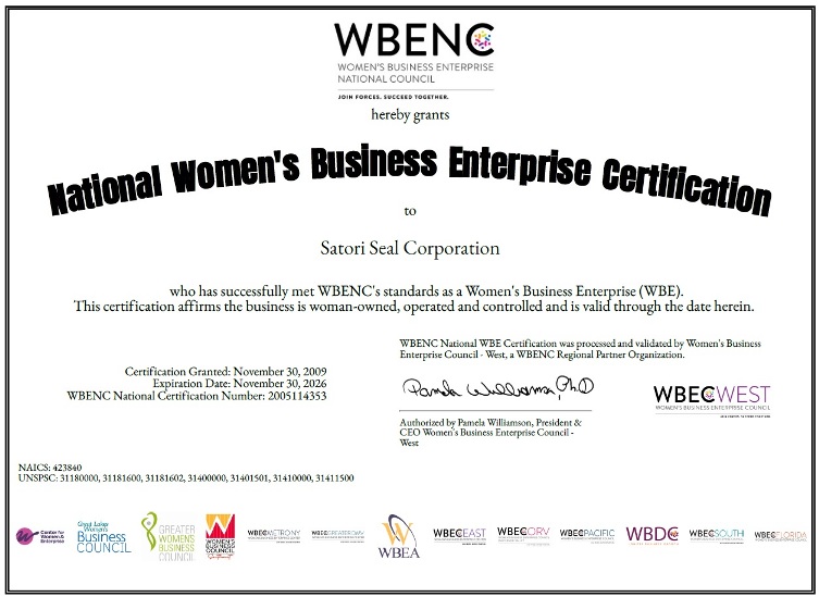 Satori Seal is a certified Women Owned Business. Satori Seal can assist you in meeting diversity spend and inclusion goals mandated by the government and many private sector companies. The Women’s Business Enterprise National Council (WBENC) is widely recognized and dedicated to advancing the success of certified women’s business enterprises.